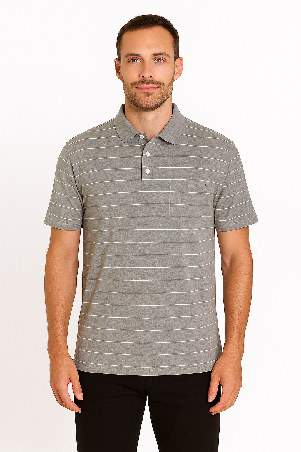 Colour: Grey golfer with white stripes. Fabric: Polycotton Blend Style Detail: