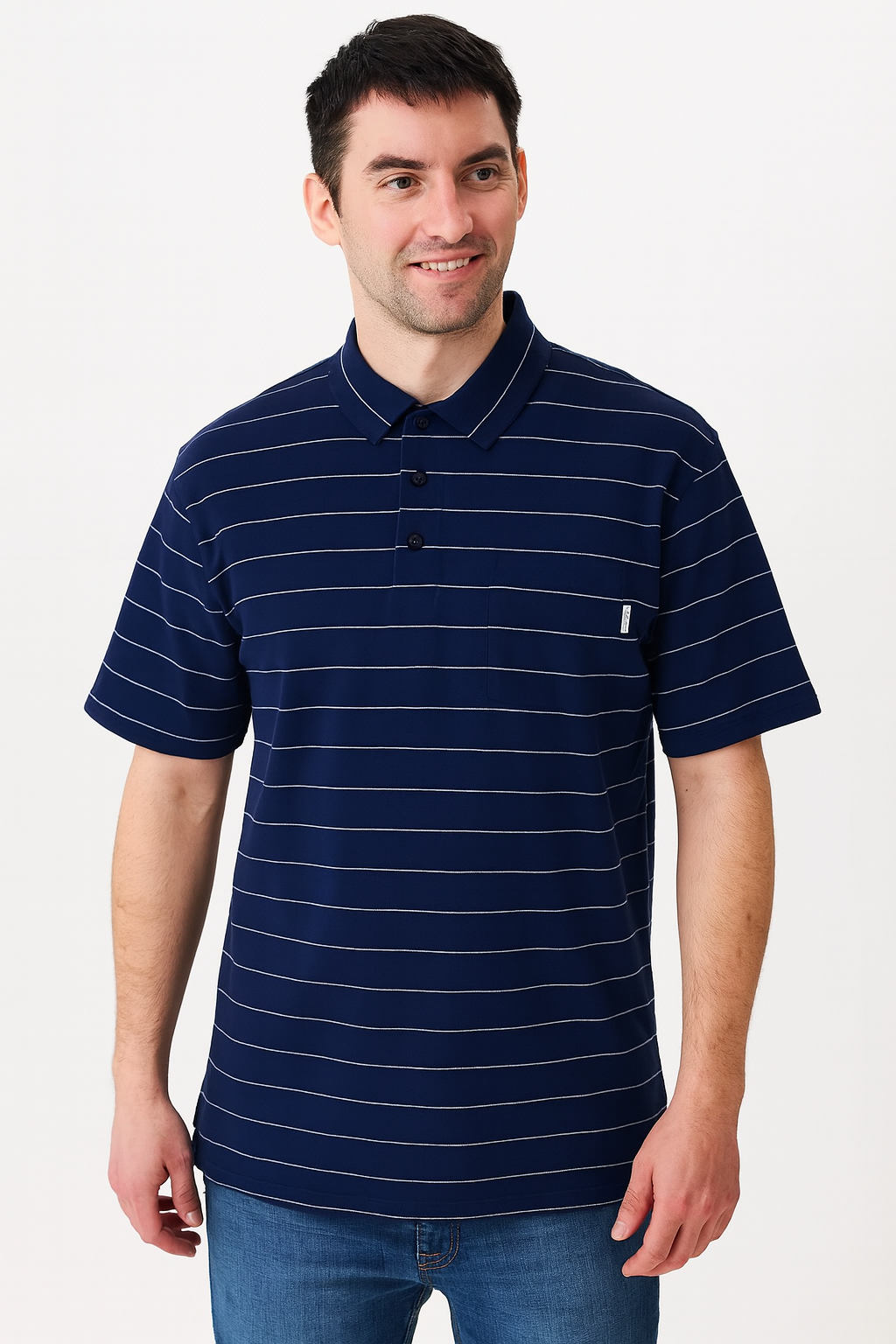 Colour: Navy golfer with white stripes. Fabric: Polycotton Blend Style Detail: